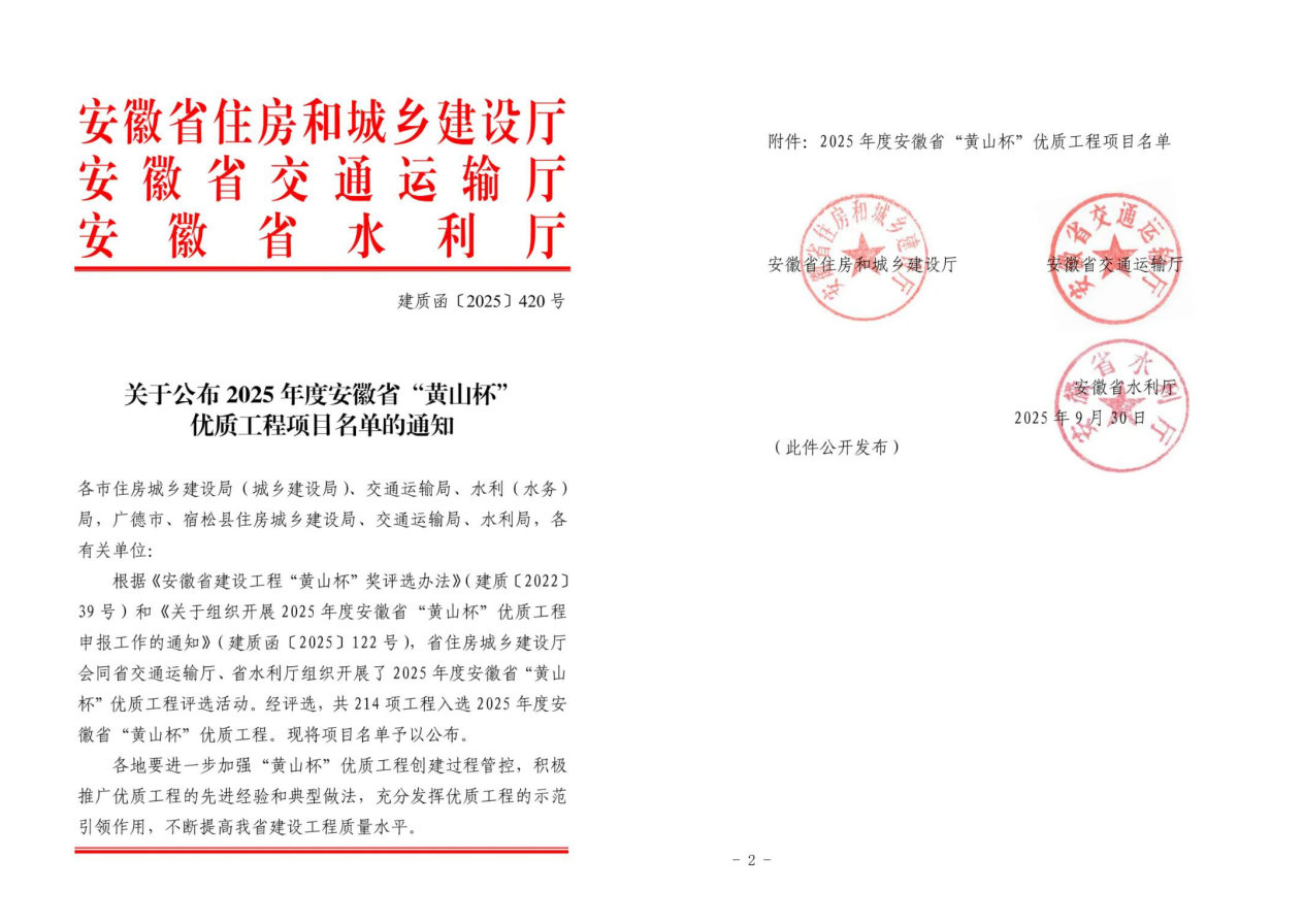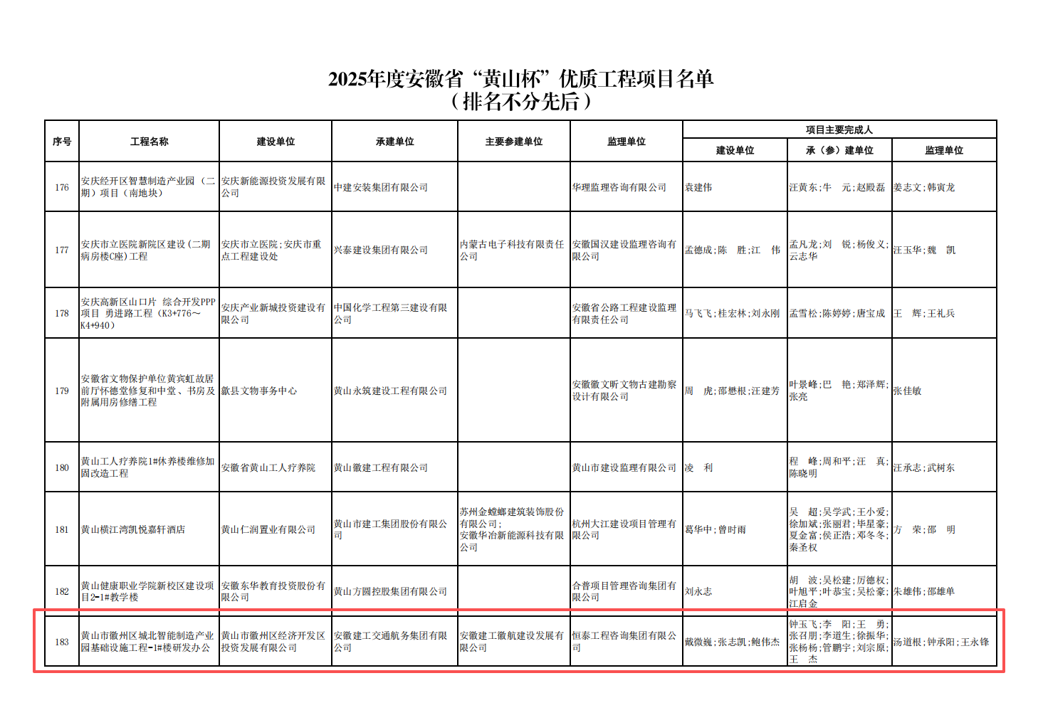 由安徽省住房和城乡建设厅、安徽省交通运输厅、安徽省水利厅联合主办的2025年度安徽省“黄山杯”优质工程评选活动中,恒泰工程咨询集团有限公司监理的黄山市徽州区城北智能制造产业园基础设施工程-1#楼研发办公项目凭借卓越品质成功入选,荣登安徽省建设工程质量最高荣誉殿堂,摘得“黄山杯”奖桂冠。