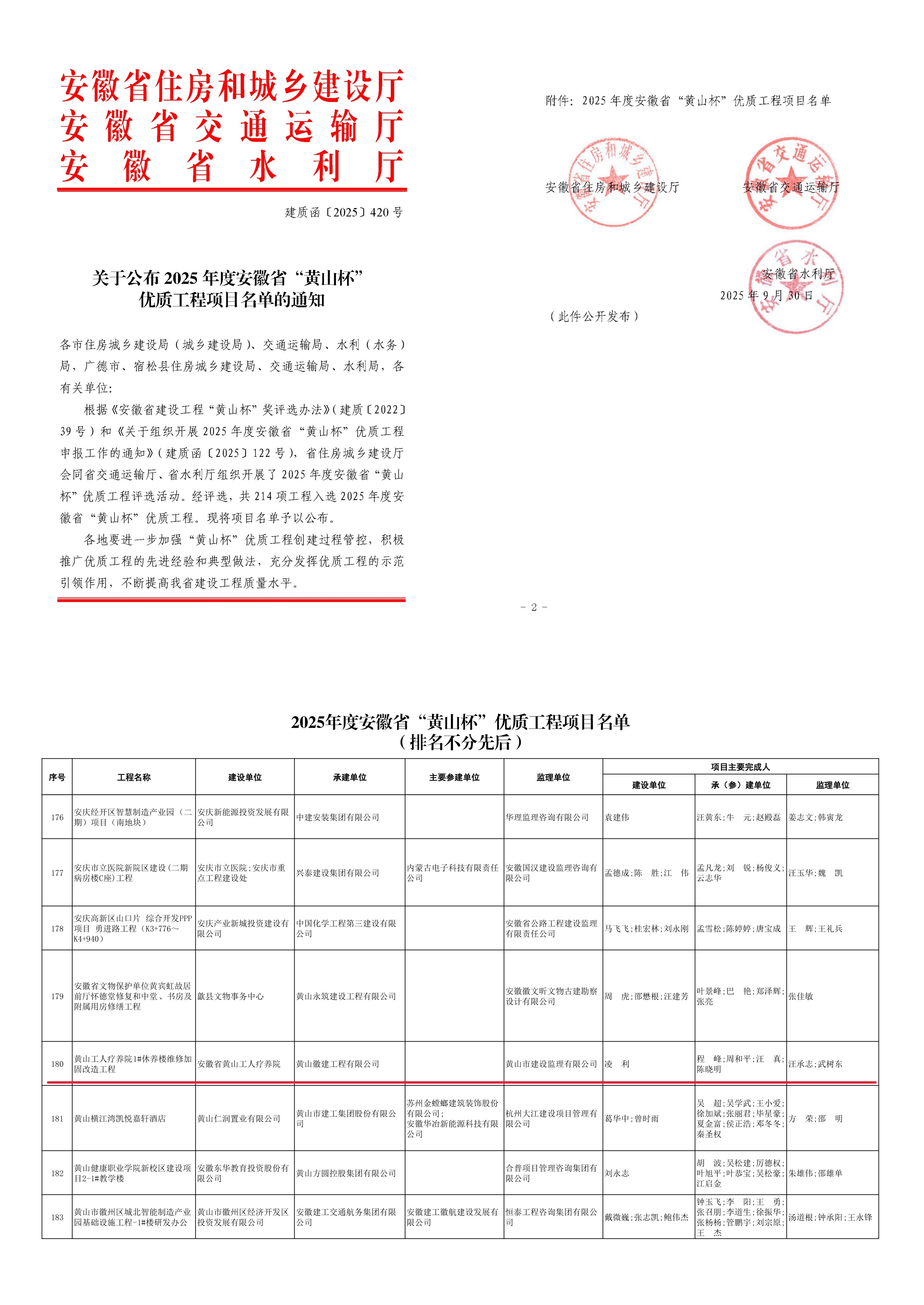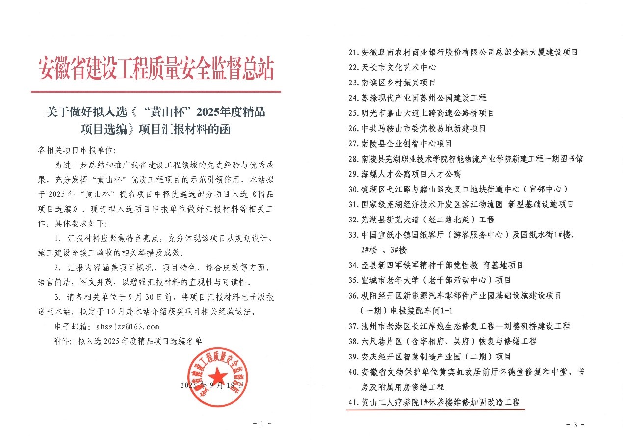 近日,安徽省住房和城乡建设厅公布了2025年度安徽省 “黄山杯”优质工程项目名单,由我司承建的黄山工人疗养院1#休养楼维修加固改造工程名列其中,更从全省 215 个 “黄山杯” 获奖项目中脱颖而出,入选年度 “黄山杯” 精品项目(全省仅择优推选 41 个),标志着我司在工程质量领域再攀新高峰。