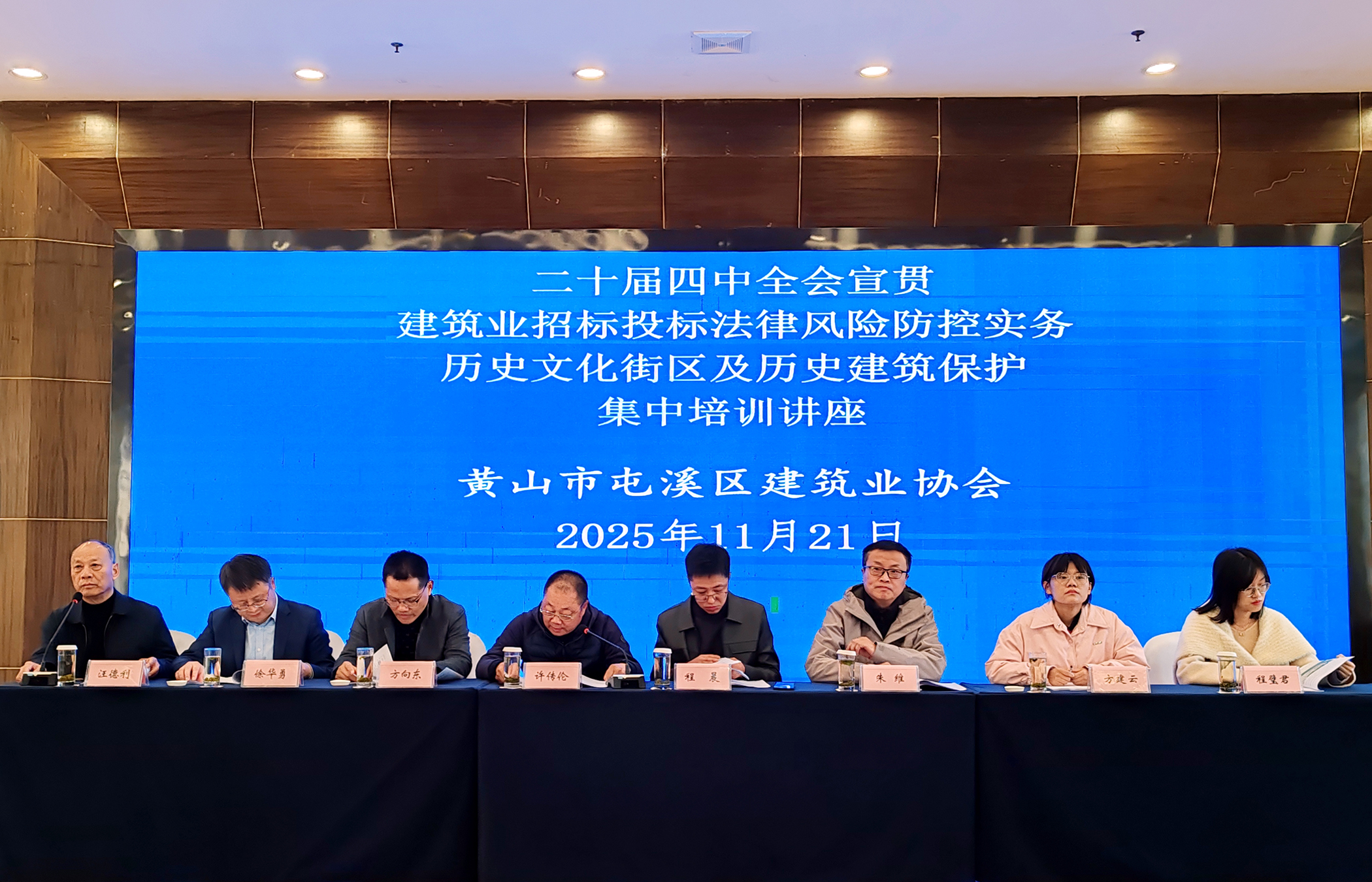 2025年11月21日上午,黄山市屯溪区建筑业协会在同聚楼大饭店徽州厅成功举办“党的二十届四中全会宣贯、建筑业企业法务、历史文化街区及历史建筑保护”集中培训讲座。五十余家会员单位的党务、法务、经营等分管领导及工作人员参会,屯溪区住建局质管站站长程晨、市级党建指导员团市委工会主席朱维、区级党建指导员阳湖镇党委委员方建云莅会指导。