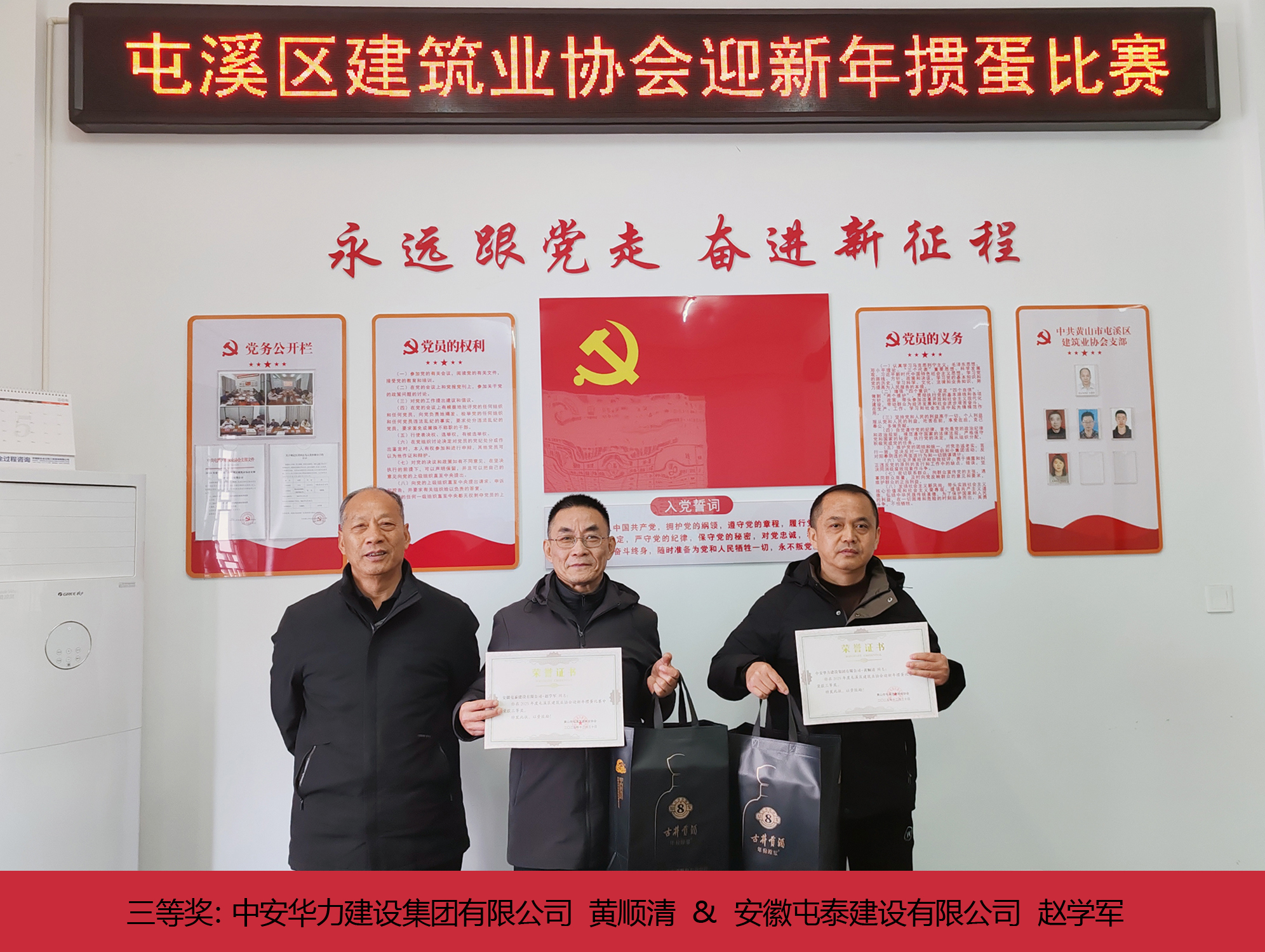 经过激烈角逐,比赛各奖项尘埃落定。中安景泰建设集团有限公司王兴东与安徽仲达建设工程有限公司王华张凭借稳定的发挥和默契的配合斩获第一名;黄山市市政园林有限公司姚威、黄山市建工集团股份有限公司黄正光荣获第二名;中安华力建设集团有限公司黄顺清、安徽屯泰建设有限公司赵学军摘得第三名。颁奖环节中,执行会长许传伦、监事叶景峰和秘书长汪德利分别为一、二、三等奖选手颁奖,全体参赛选手也均获得精美伴手礼一份。活动最后,所有参赛选手、嘉宾及工作人员共同合影留念,定格下这一欢乐祥和、团结奋进的美好时刻。