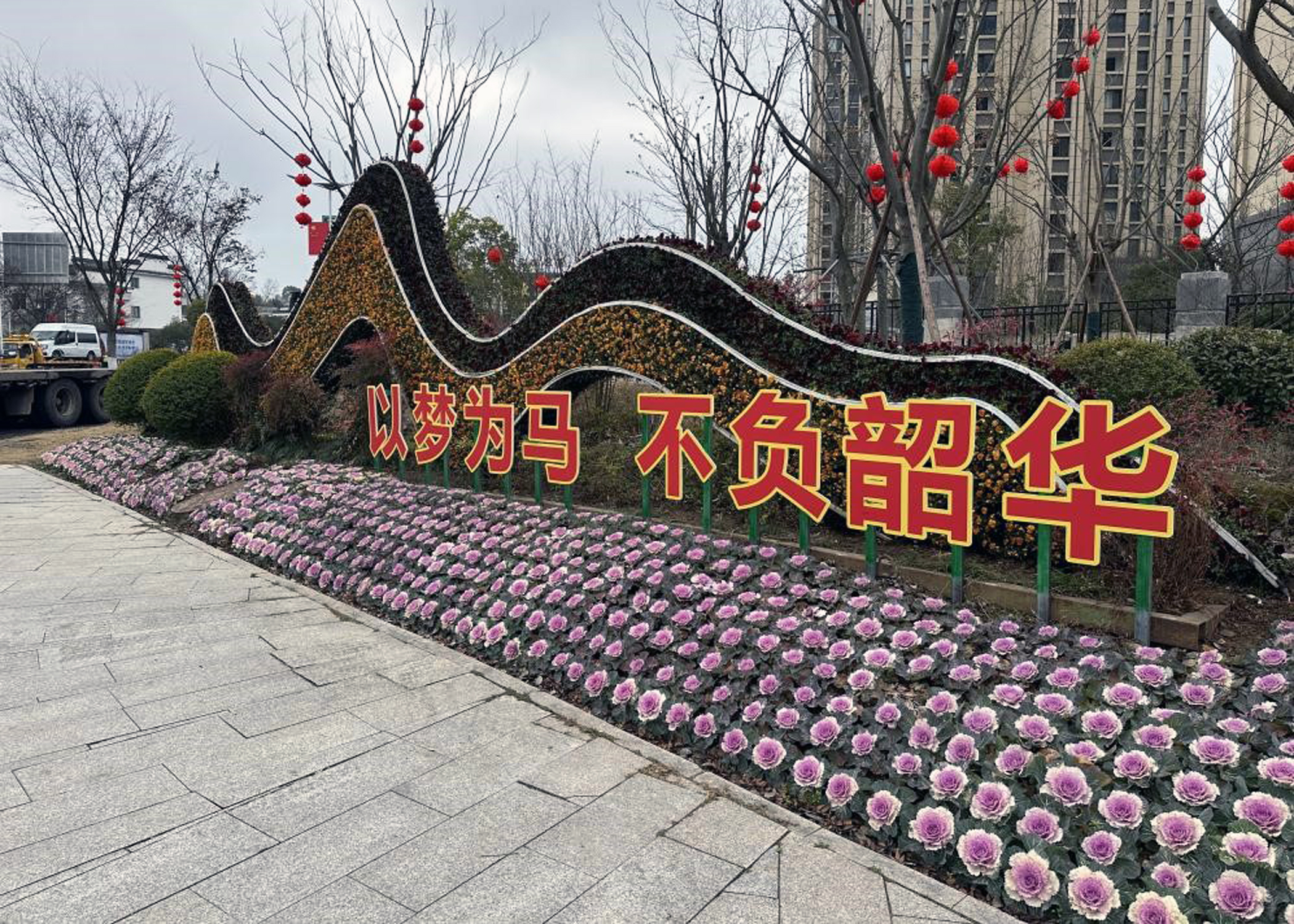 在黄山路、北海路、迎宾大道、柏山路等11处重要节点与门户区域,开展冬季时令草花栽植作业。选用耐寒性强、观赏效果佳的羽衣甘蓝、三色堇等花卉,共计栽植23.5万余株,色彩明快的花带层次丰富、错落有致,在冬日里绽放生机,与周边建筑、道路景观相得益彰,有效提升城市门户形象。推进南滨江花海打造,种植观赏性强、花期适配的金鱼草6万株,成片花海将形成绚烂多彩的生态景观带,成为市民休闲打卡的新选择;同步开展绿雕草花布置工作,在人民广场、水车广场、观光索桥等9个核心节点的21座绿雕上,精心搭配栽植草花9万株,通过立体景观与花卉色彩的巧妙融合,让绿雕更具灵动气息,为城市空间注入浓浓的新春活力与艺术氛围。