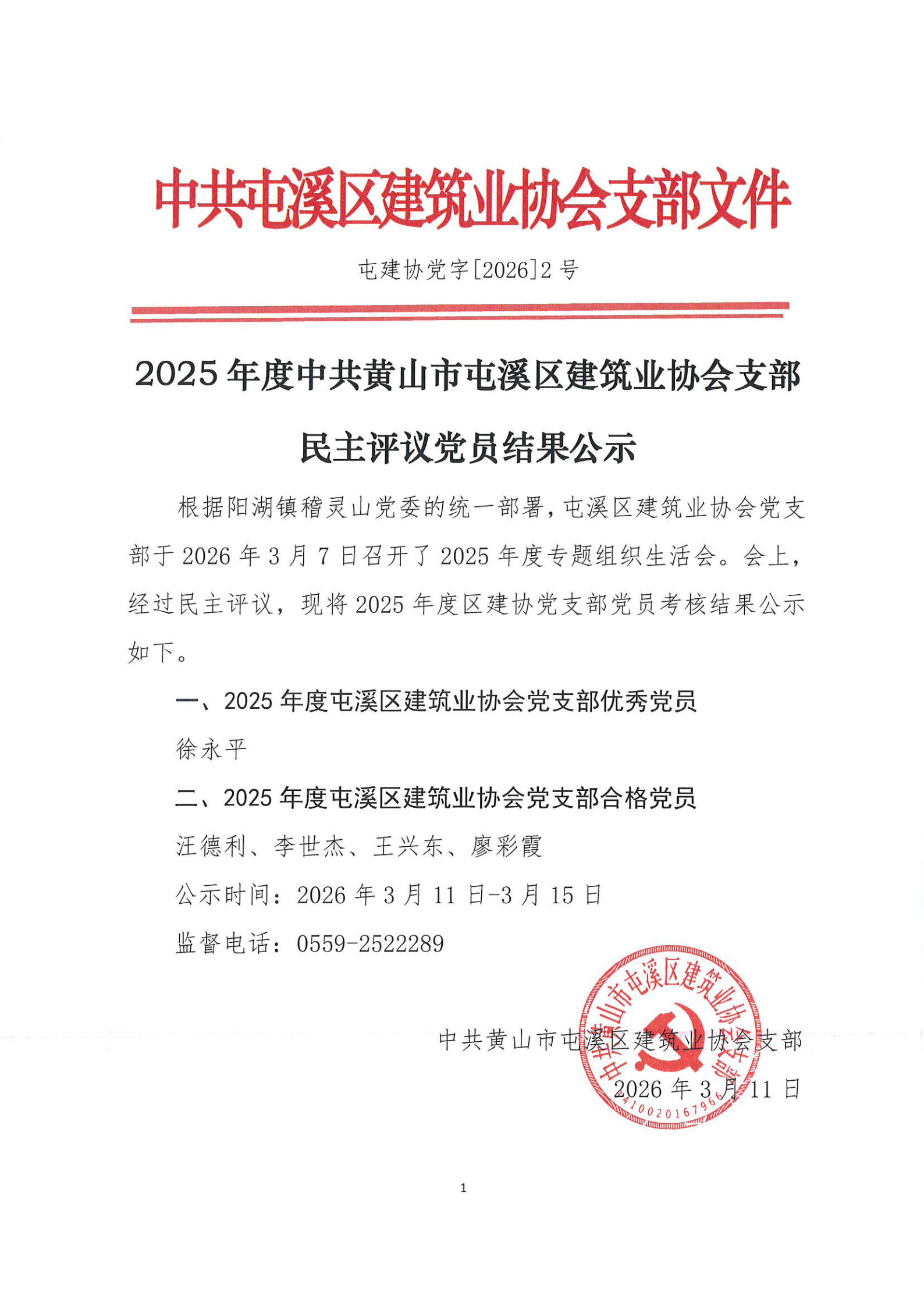 2025年度中共黄山市屯溪区建筑业协会支部民主评议党员结果公示