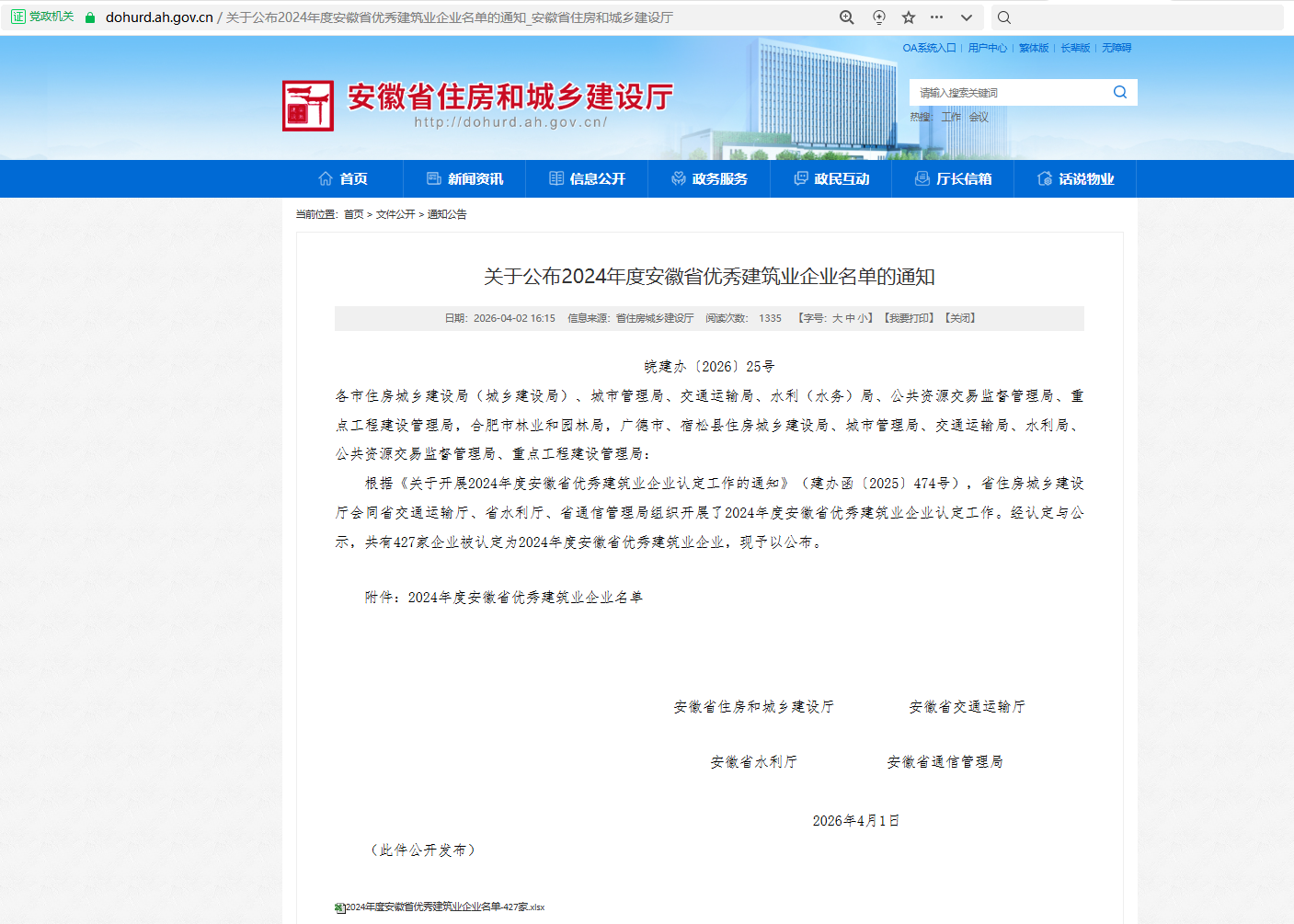 近日,安徽省住房和城乡建设厅公布了2024年度安徽省优秀建筑业企业名单,鸿茂建设集团凭借优异的综合实力和良好的社会信誉,再次榜上有名。这是我司继2022年、2023年之后,连续第三年获此殊荣。