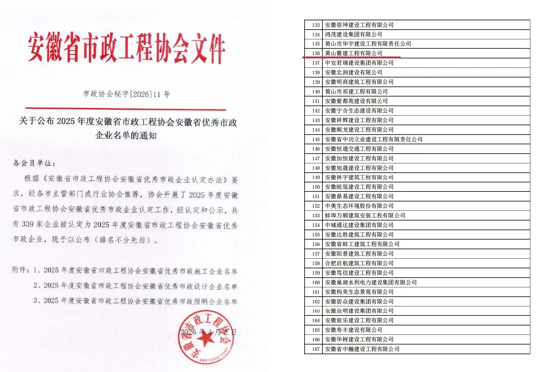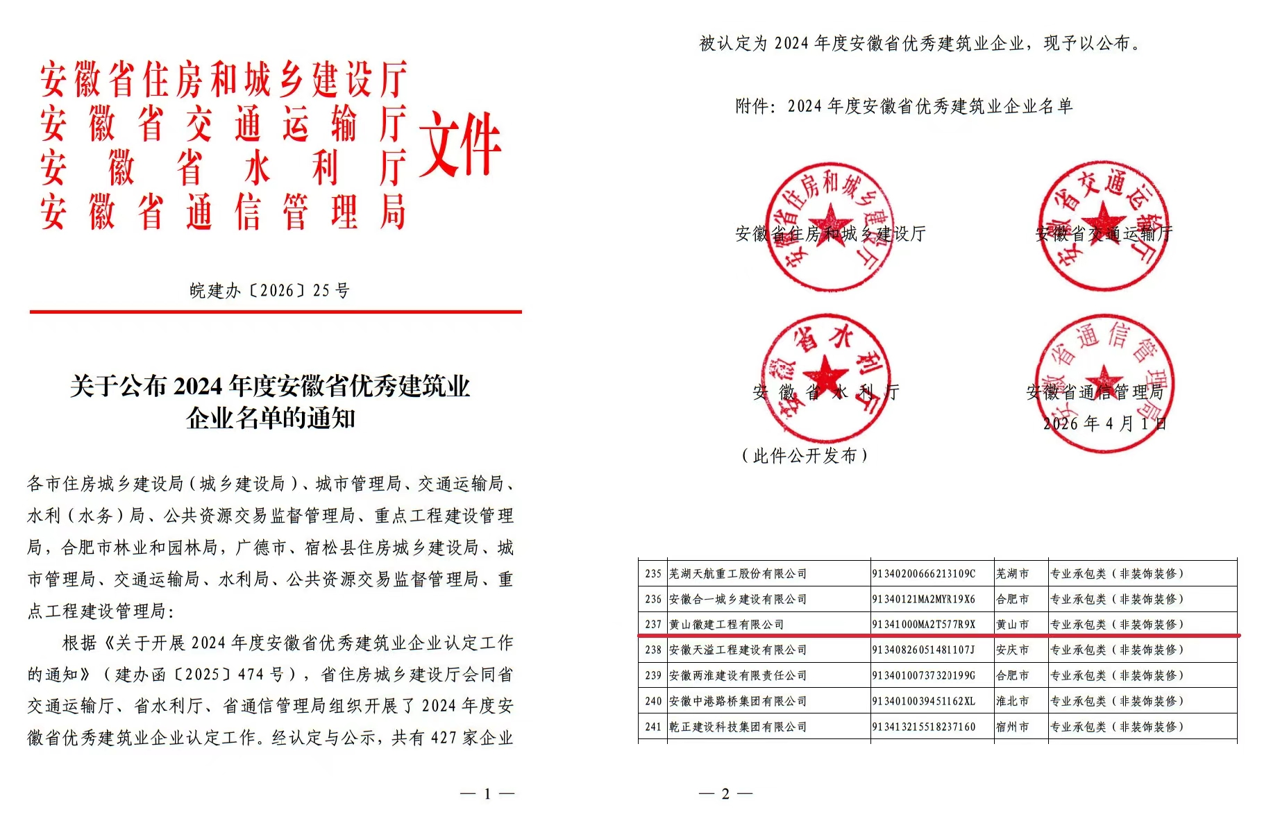 近日,安徽省建筑业领域年度评选结果公布,黄山徽建工程有限公司凭借过硬的综合实力、优质的工程品质和良好的行业口碑,在众多参评企业中脱颖而出,荣膺 “安徽省优秀建筑业企业”“安徽省优秀市政施工企业” 双项省级殊荣,彰显了公司在建筑及市政施工领域的标杆实力。