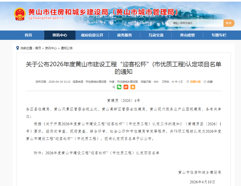 近日,由黄山市顺兴建筑安装工程有限公司承建的新潭社区邻里中心项目,凭借卓越的工程品质与出色的建设成效,荣获2026年度黄山市建设工程“迎客松杯”。