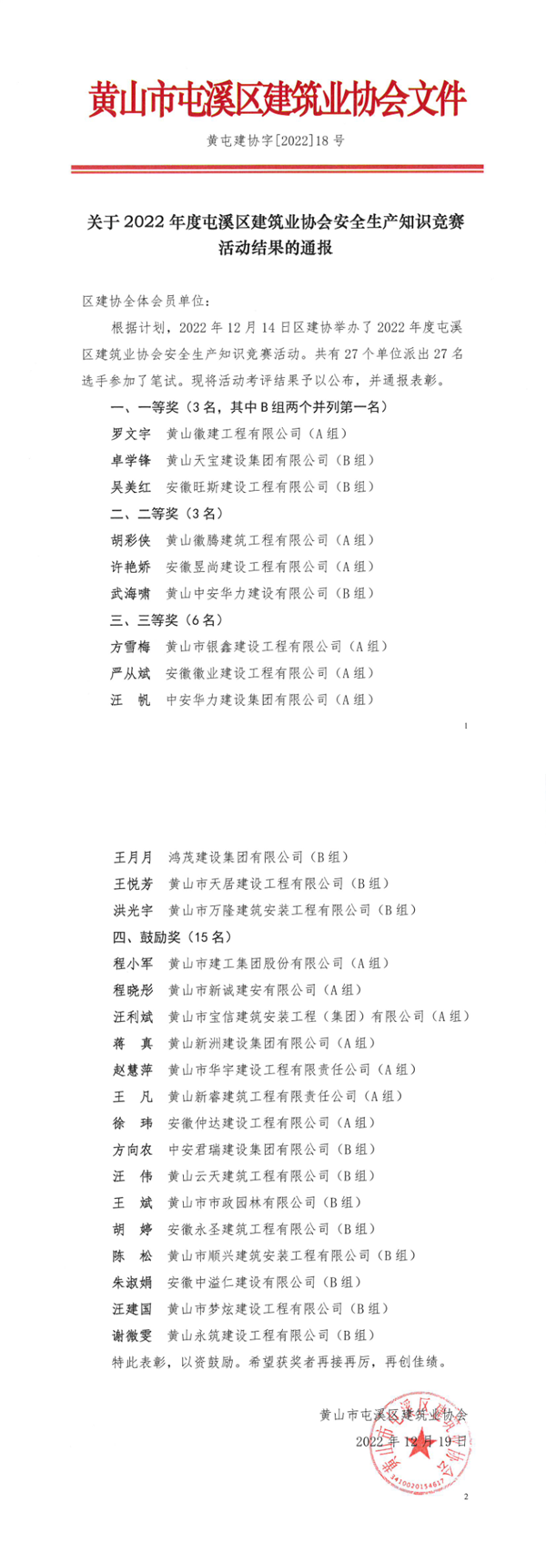 关于2022年度屯溪区建筑业协会安全生产知识竞赛活动结果的通报