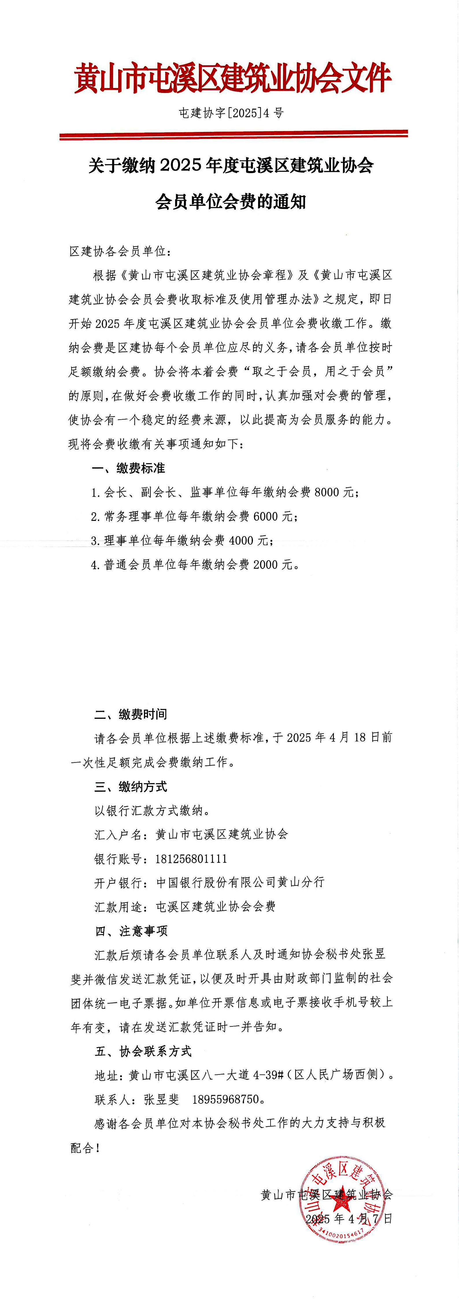 关于缴纳2025年度屯溪区建筑业协会会员单位会费的通知