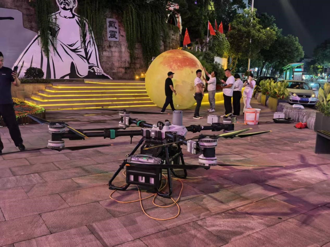 当民谣的余音在林间缭绕,无人机挂载月亮,于山顶精准升起,为了一场更为震撼的视觉盛宴在夜空上演,目前每晚进入紧张的测试阶段。