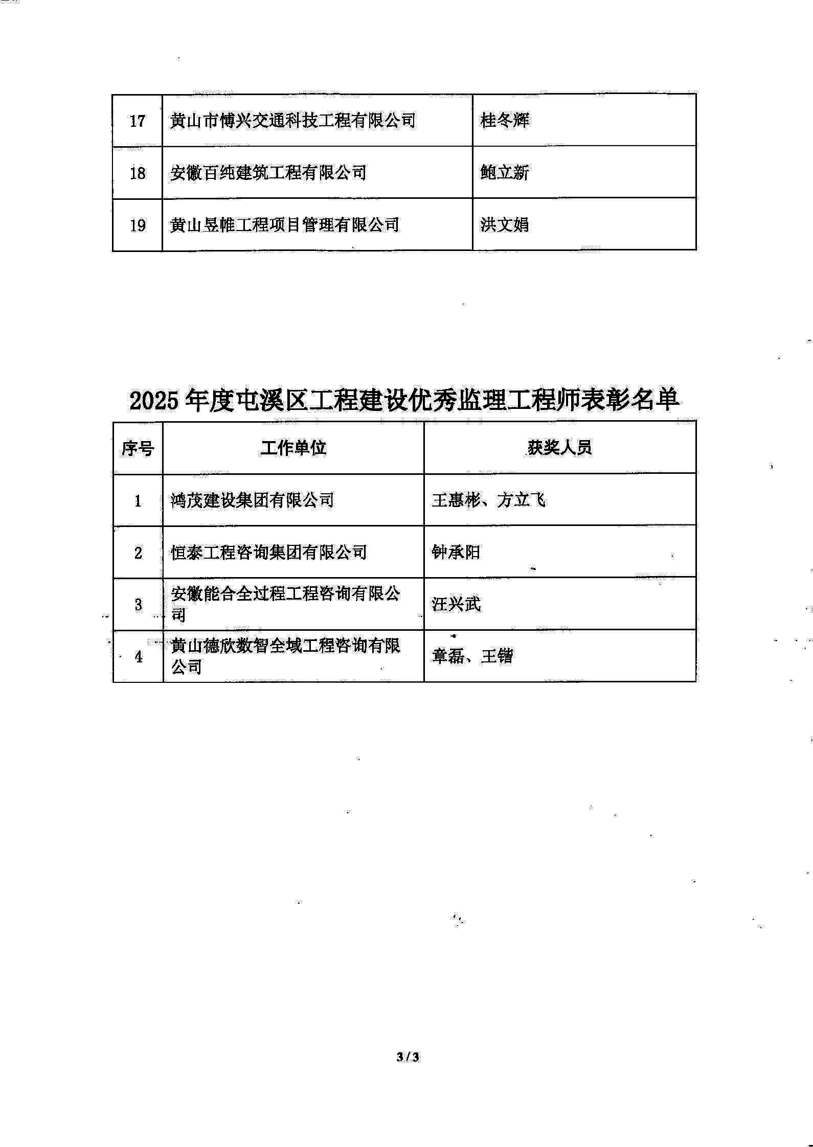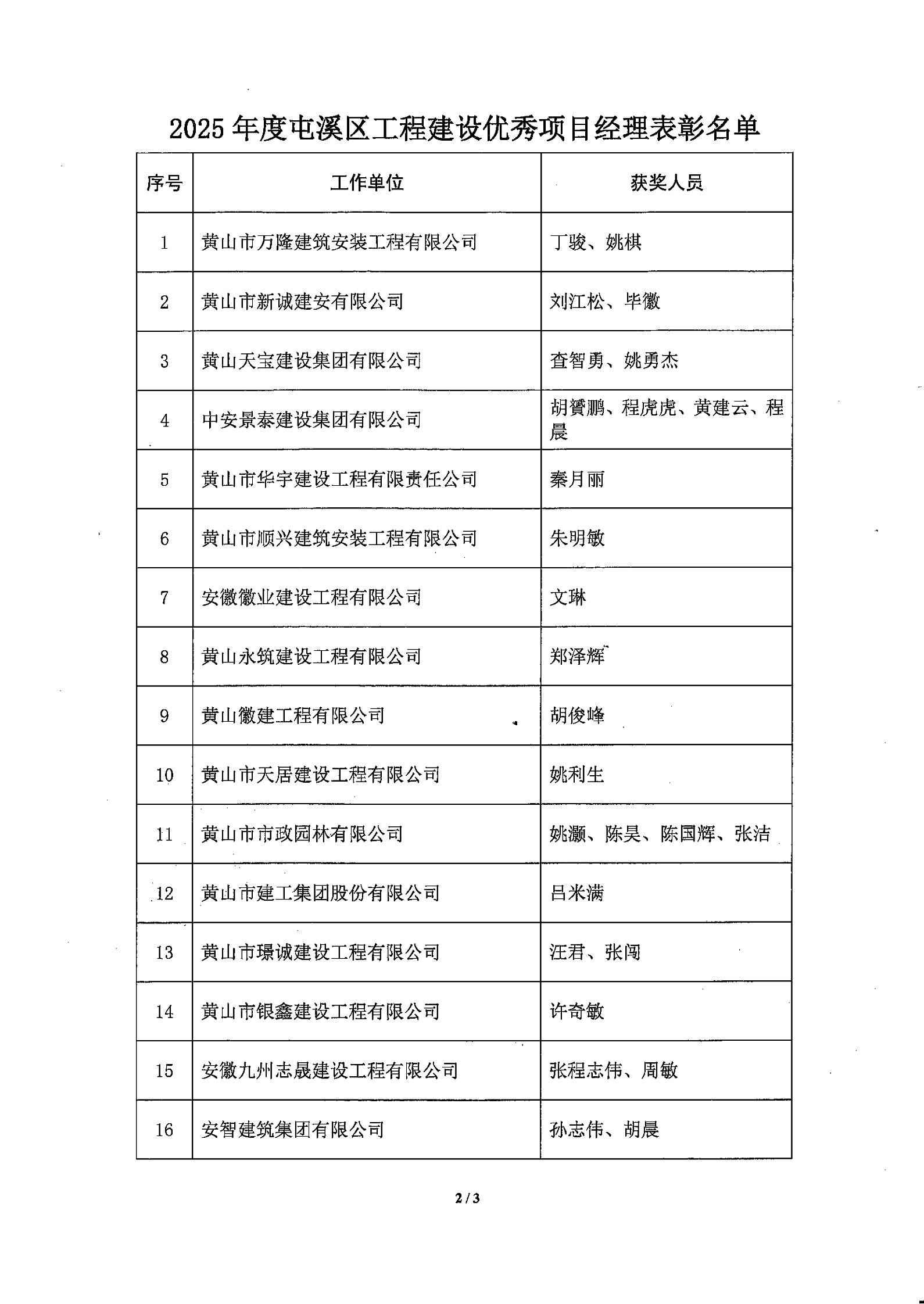 关于通报表彰2025年度屯溪区工程建设优秀项目经理和优秀监理工程师的通知