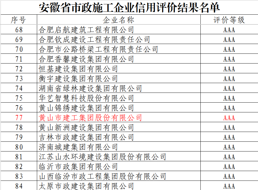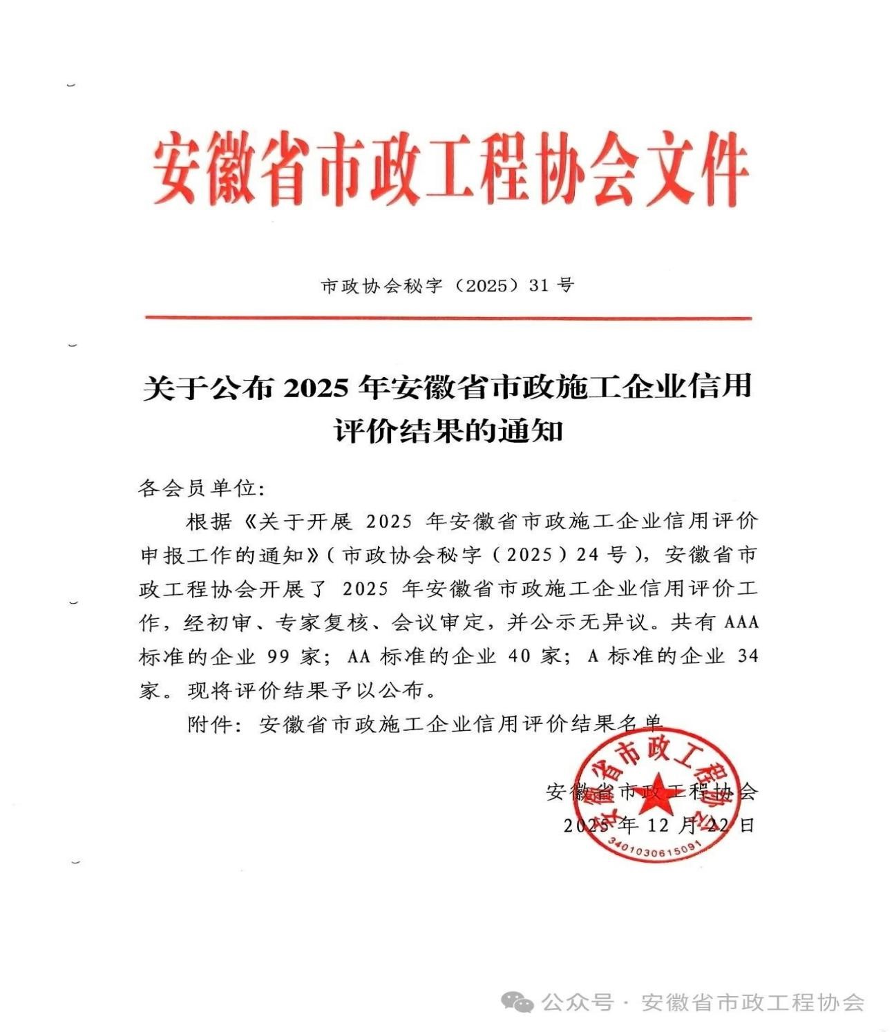 近日,安徽省市政工程协会正式发布《关于公布2025年安徽省市政施工企业信用评价结果的通知》。黄山市建工集团凭借卓越的综合实力、规范的市场行为、优良的工程品质及坚实的信用体系建设,成功获评最高信用等级——AAA级。标志着集团在诚信经营、履约能力与社会责任履行方面获得了行业主管部门与协会的高度认可,是企业信用建设领域的又一重要里程碑。